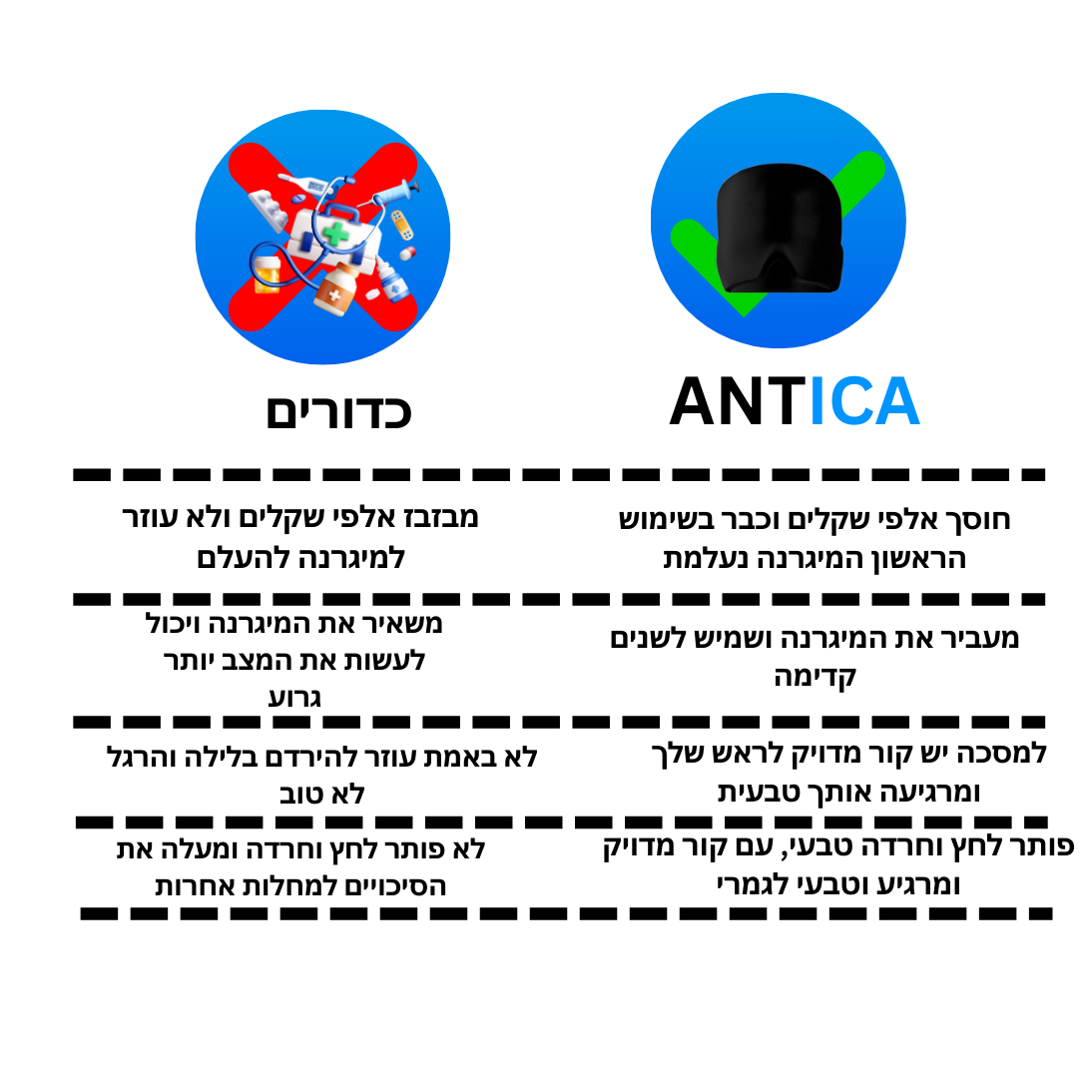 רוב האנשים יקחו כדורים, תרופות, ועוד... אבל לא מבינים שזה רק פוגע בהם יותר, מחקרים מראים שכדורים לכאבי ראש לא רק שלא פותרים את הבעיה מהשורש שלה, אלא גם פוגעים לך במערכת החיסונית, גורמים לבעיות לב, מחלות בכבד ואפילו לסרטן. וזה הדבר האחרון שאנחנו רוצים שיקרה לך.