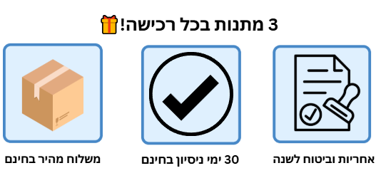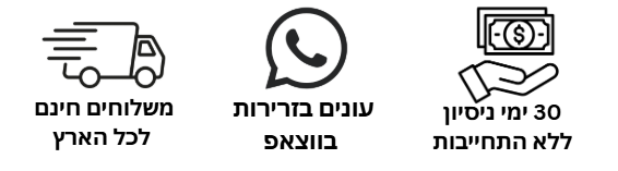 יש לנו מדיניות של 30 יום החזרים מיום קבלת המוצר, לכן אין לכם סיבה לדאוג, אם אתם לא מרוצים ממוצר יש לך שירות לקוחות זמין בצד הימני של המסך תשלחו הודעה ונשמח לעזור💙